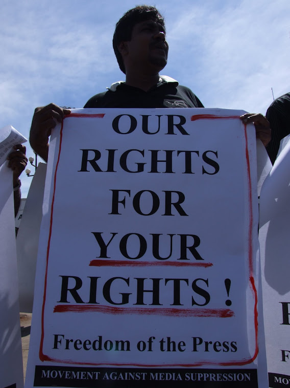 "Our strength is pen", We will continue to write, even our hands are chopped", "We will not stop writing". These were some of the slogans shouted during the protest on November 6 th 2007 in front of the Fort Railway Station. It was organized by the Movement Against Media Suppression (MAMS). Free Media Movement, Sri Lanka Working Journalists Association, Federation of Media Employees Trade Unions, Sri Lanka Tamil Media Alliance and Sri Lanka Muslim Media Forum have joined hands to fight for media freedom in Sri Lanka. The journalists, civil rights activists and human rights activists who support the decision to have a protest against the media suppression have participated.